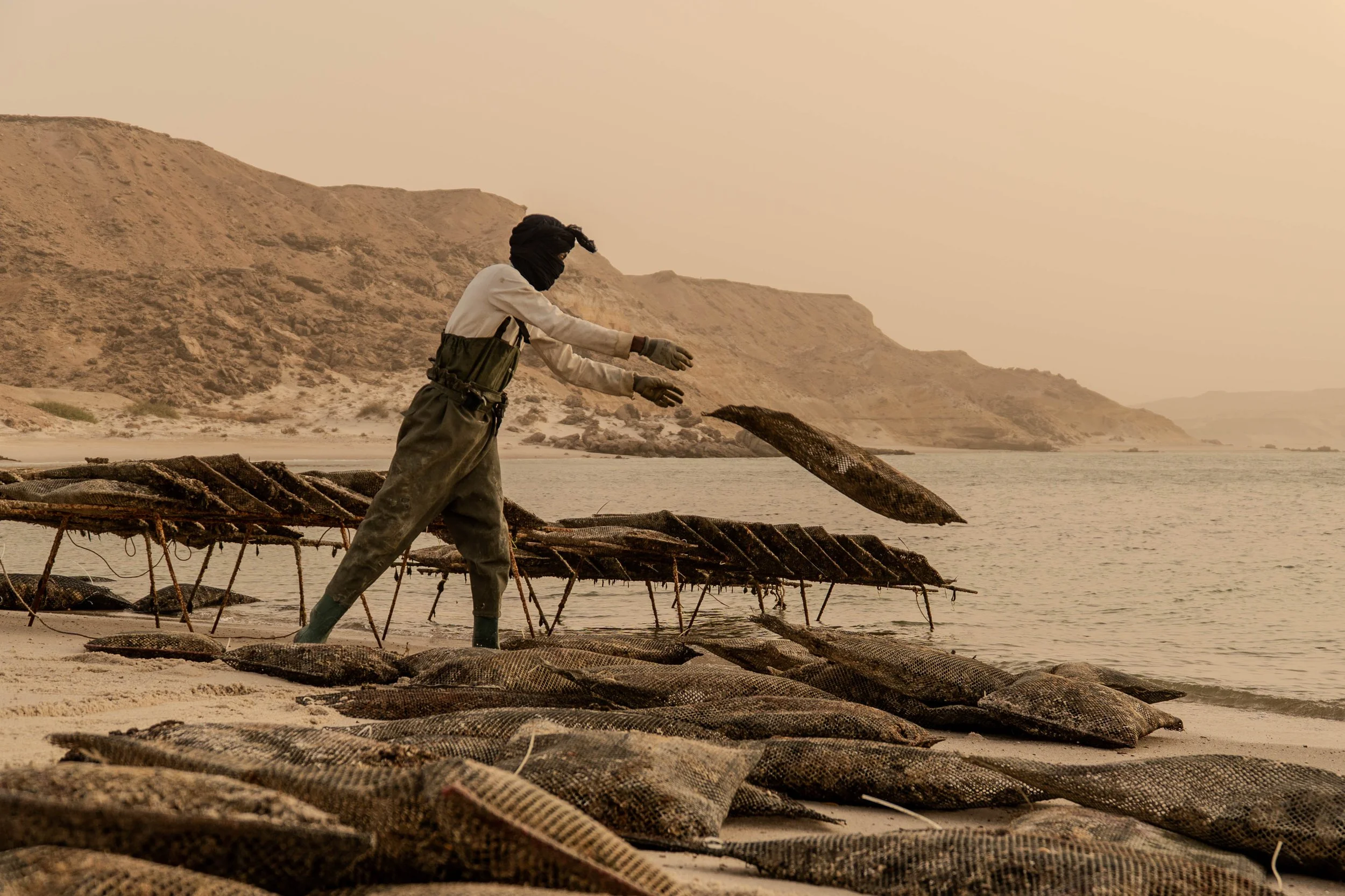 The most important connection I made in Dakhla was to a group of oyster fishermen who lived and worked about a mile down the beach. These men, of which there were usually 8 or 10, lived all together in a cross between a house and a tent, that I have to guess was about 200 square feet. They spent their days working long hours in the Moroccan sun, moving heavy metallic bags of oysters and sorting them to be sold to markets and restaurants in Dakhla city, about an hour away.